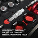 Every tool is secured in precision-cut dual-tone EVA foam for perfect organization, visibility, and protection. Housed in a rugged 20-gauge steel hand carry box, the MotoBox is compact, portable, and durable, with a key lock and resettable combination lock system to keep your investment safe.